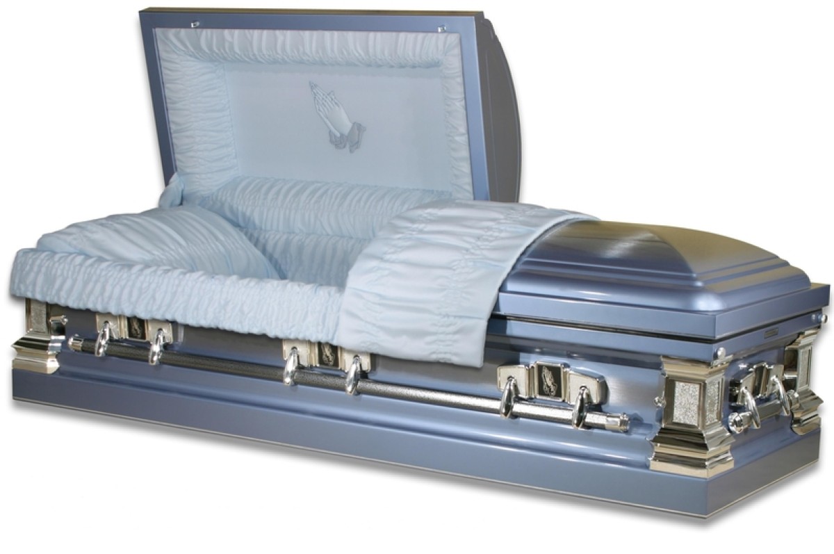 18 gauge steel casket with gasket and key locking mechanism. Powder blue with silver brushed top & sides, pin-striping, light blue tailored interior with matching pillow and throw. Half-couch eterna-rest adjustable bedding system, memorial tube and swing hand bars.