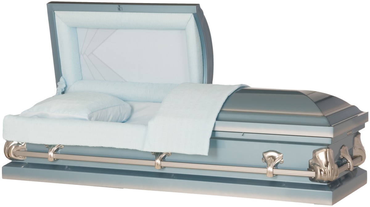 20 guage steel casket, non-gasketed construction with snap-locking mechanism. Powder blue with silver highlights, light blue tailored interior with matching pillow and throw. Half-couch eterna-rest adjustable bedding system and stationary hand bars.
