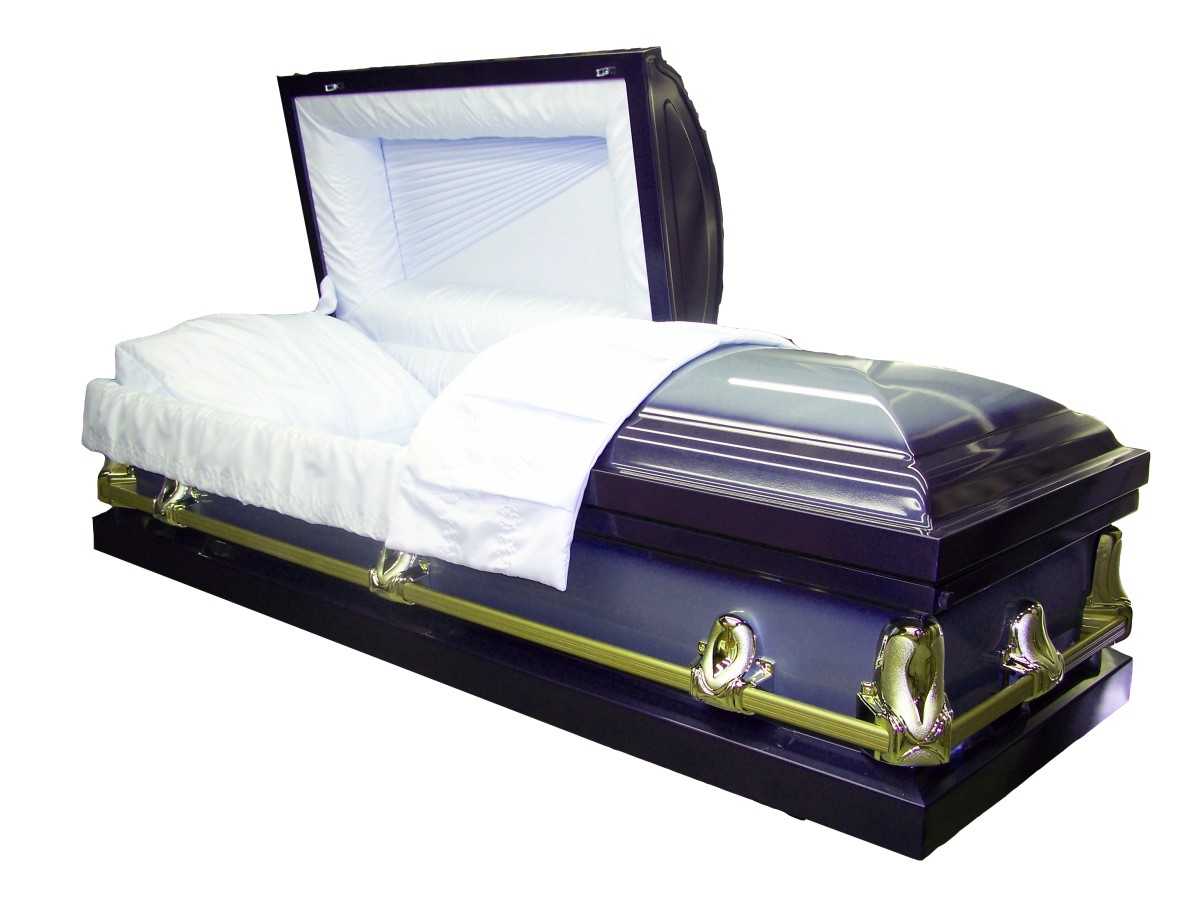 20 gauge steel casket with gasket and key locking mechanism. Neo Blue with powder blue highlights, light blue tailored interior with matching pillow and throw. Half-couch eterna-rest adjustable bedding system and stationary hand bars.