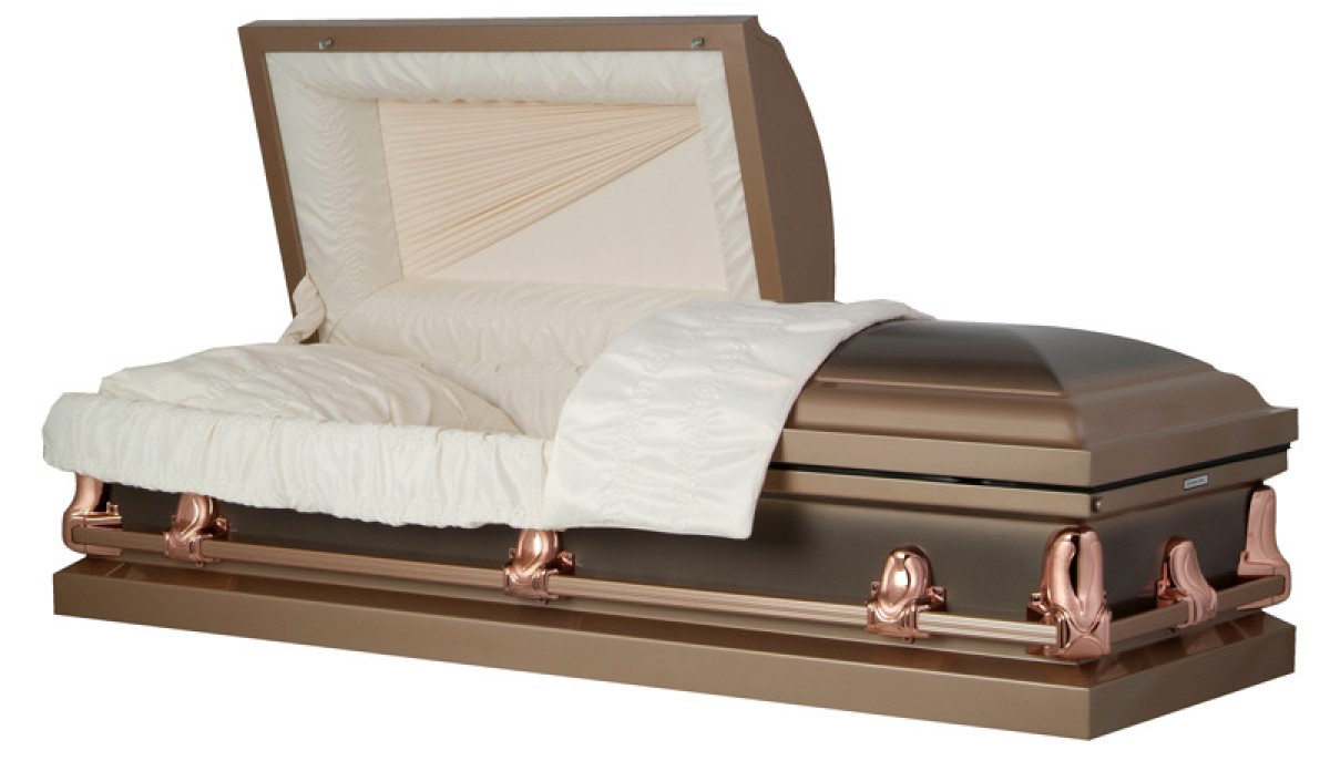 20 guage steel casket with gasket and key locking mechanism. Coppertone with venetian bronze highlights, rosetan tailored interior with matching pillow and throw. Half-couch eterna-rest adjustable bedding system and stationary hand bars.
