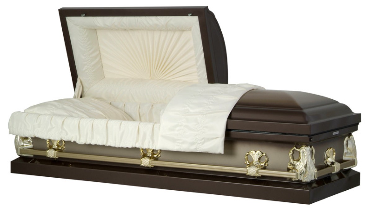 20 guage steel casket with gasket and key locking mechanism. Venetian Bronze with sunset gold highlights, eggshell tailored interior with matching pillow and throw. Half-couch eterna-rest adjustable bedding system and stationary bars.