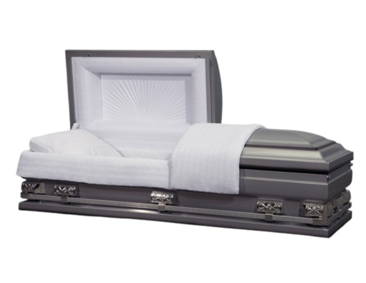 33" OS, 20 gauge steel casket with gasket and key locking mechanism. Silver with ebony highlights, white crepe interior with matching pillow and throw. Half-couch eterna-rest adjustable bedding system and stationary hand bars.