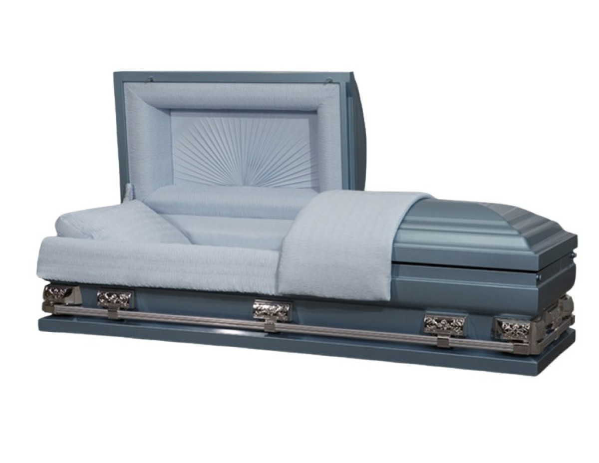 33"OS, 20 gauge steel casket with gasket and key locking mechanism. Blue with silver highlights, blue crepe interior with matching pillow and throw. Half-couch eterna-rest adjustable bedding system and stationary hand bars.